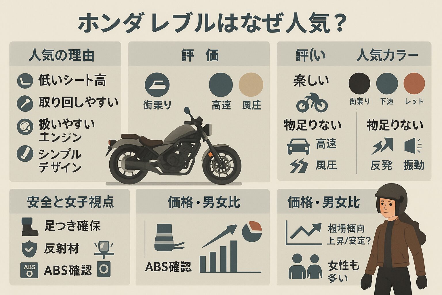 ホンダ レブルはなぜ人気があるのか?安全装備や女子視点までを網羅 公開日:2025年10月12日 バイク全般 この記事にはプロモーションが含まれています。 レブルに興味があり、ホンダ レブル なぜ人気と検索した方に向けて、レブル250が人気な理由や口コミの傾向、なぜ嫌われると言われる背景、人気カラーの動向までを一度に把握できるよ […] 続きを読む