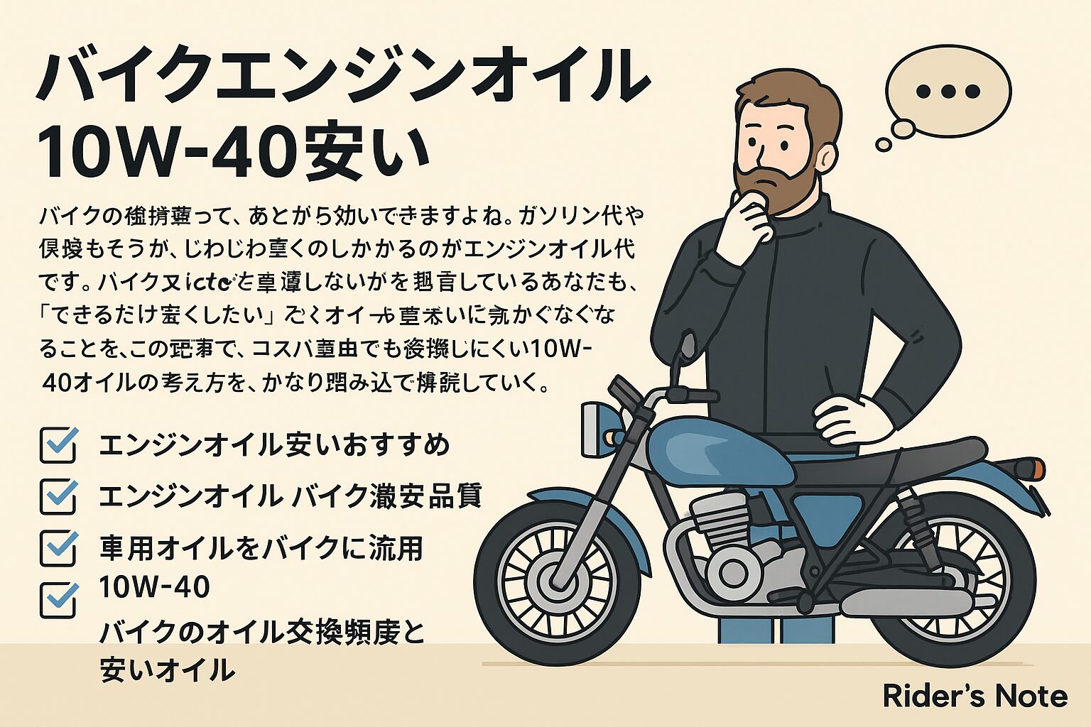 バイクのエンジンオイル10w40が安い?!おすすめと交換頻度完全ガイド 公開日:2025年12月15日 バイク全般 この記事にはプロモーションが含まれています。 バイクの維持費って、あとから効いてきますよね。ガソリン代や保険もそうですが、じわじわ重くのしかかるのがエンジンオイル代です。バイクエンジンオイル10w40安いで検索しているあ […] 続きを読む