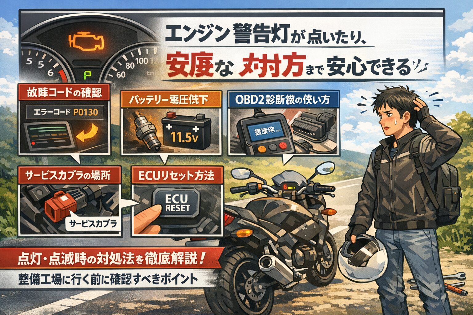 バイクのエンジン警告灯の原因と消し方を症状別にわかりやすく解説 公開日:2025年12月21日 バイク全般 この記事にはプロモーションが含まれています。 走行中にバイクのエンジン警告灯が点いたり、点滅に気づいたりすると、原因が分からなくて焦りますよね。あなたがバイクのエンジン警告灯の原因や消し方を探しているなら、警告灯が消えな […] 続きを読む