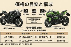 国内仕様の参考価格として、ZX-4R SEは1,177,000円、上位グレードのZX-4RRは1,210,000円(いずれも消費税込)となっており、400ccクラスとしてはプレミアムスポーツの範疇に入ります。この価格差は、主にリアサスペンションの構造(ZX-4RRはBFRC liteショックを採用)や、細部の仕上げ・セッティングに起因します。両モデルともABS(アンチロック・ブレーキ・システム)、KTRC(カワサキ・トラクション・コントロール)、2段階のパワーモード、そしてアップ/ダウン対応のクイックシフターを標準装備しており、電子制御の完成度が非常に高い点が特徴です。