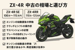 ZX-4Rは性能と技術が詰まったハイエンド400ccスポーツのため、中古であってもコンディションを見極める目が求められます。しっかり整備された個体を選べば、新車に近いフィーリングで長く楽しむことができます。