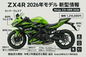 | Kawasaki ZX-4R | 並列4気筒 DOHC 16バルブ | フルカウル・スーパースポーツ | 約117〜121万円 | 高回転型エンジンと電子制御を両立 |