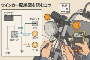 ウインカーの実配線を追う際は、左右ウインカーのコネクタ付近とハンドル左スイッチ周り、ウインカーリレーの三点を起点に色と導通を確認すると全体像を把握しやすくなります。