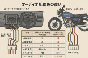 オーディオ側の色は、あくまで機器内部機能を車体側に分かりやすく接続するための「メーカー慣習」であり、車体ハーネスの規格を示すものではありません。一方で二輪の配線色は、整備マニュアルの凡例に基づく「車種固有の仕様」です。両者を混同すると、例えばイルミ電源を誤ってウインカー系統へ接続し、ハザード点灯時にメーター照明が同期してちらつく、あるいはアースを誤認してリレーが不作動になるといった不具合が生じます。