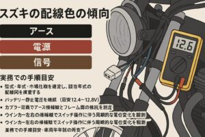 メーカーや年式、販売市場ごとに配線色の凡例は変化し、同じ色でも役割が一致しない場合があります。とくにスズキは型式やマイナーチェンジで運用が変わる事例が見られるため、作業の入口でアース・電源・信号の三分類を切り分け、色の先入観を排した同定プロセスを徹底すると安全性が高まります。アース色の扱いと左右ウインカーの信号色は混同が起きやすいため、まずはアース線を確実に特定し、そのうえで右左の信号線を順番に追う流れが合理的です。