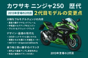 2013年登場の2代目Ninja250は、名前からRが取れて「Ninja250」となり、見た目も中身もかなり現代的に生まれ変わりました。ここで一気に「今のニンジャ250のイメージ」が固まったと言っていいくらい、大きな転換点になった世代です。あなたが街中でよく見かけるニンジャ250の姿は、この2代目以降のスタイルかもしれません。