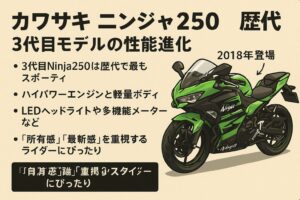 カワサキニンジャ250の歴代モデルは世代ごとに性能やキャラクターが大きく異なるため、どの年式を選ぶべきか迷う人が多くいます。特に初めて購入する場合は、パワーや乗りやすさ、維持費、中古相場など不安もありますよね。歴代モデルの情報はネット上に点在しており、「結局どれが自分に合うのか分からない」と感じやすいのも事実です。この記事では、初代から3代目、さらにNinja250SLまで年式ごとの特徴や違いを整理し、性能・価格・燃費・ライバルとの比較まで一度で理解できるようまとめています。後半では予算別・用途別・経験値別に最適なモデル選びを解説し、読み終える頃にはあなたが選ぶべきニンジャ250の姿が明確になります。