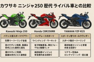 中古価格の相場感や維持費を考える際は、ニンジャ250の新車・中古価格を整理した記事もあわせて確認しておくと、より具体的なイメージが掴めると思います。