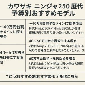 同じニンジャ250歴代モデルでも、世代によって中古価格帯は大きく変わります。ここではざっくりとした予算別に、「このあたりの世代を中心に探すとバランスが良い」という目安をまとめておきます。もちろん、地域や時期、車両状態によって価格は変わるので、あくまで「おおよその目安」として見てください。