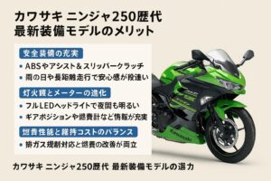 最新世代のニンジャ250歴代モデル(3代目中心)は、単純なスペックだけでなく、日常で効いてくる装備面のメリットが大きいです。ここでは、具体的にどんな点が「新しいほど得なのか」を整理してみます。特に通勤・通学やツーリングで毎日のようにバイクに乗るあなたにとっては、装備の差がそのまま快適性や安心感の差につながってきますよ。