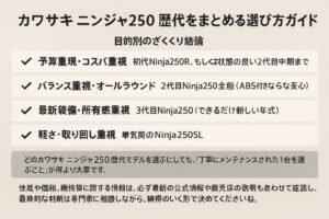 最後に、カワサキ ニンジャ250 歴代モデルの選び方を、ざっくりと整理して締めくくります。どの世代にも良さがあるので、「自分が何を一番大事にしたいか」をはっきりさせることが何より大切です。ここまで読んできて、なんとなく「自分はここが気になるな」というポイントが見えてきたと思うので、一度頭の中を整理してみましょう。
