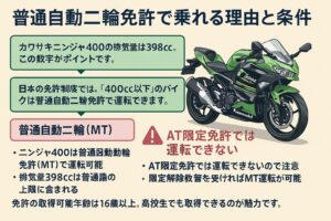 まずは「何の免許で乗れるの?」という疑問からスタートしましょう。バイクの免許区分は意外と細かく、誤解しやすいところです。ここでは、普通自動二輪免許の条件、AT限定の範囲、年齢制限など、あなたがニンジャ400に乗るために絶対に知っておきたい基本ルールを整理していきます。