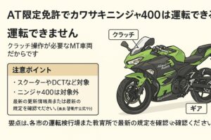 結論から言えば、AT限定免許ではカワサキニンジャ400を運転できません。理由は単純で、ニンジャ400はクラッチ操作が必要なMT車両だからです。クラッチレバーを握り、ギアを切り替えて走行する構造のため、AT免許の対象外となります。