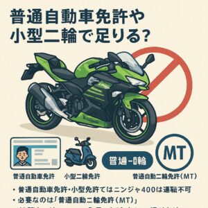 - 普通自動車免許・小型免許ではニンジャ400は運転不可