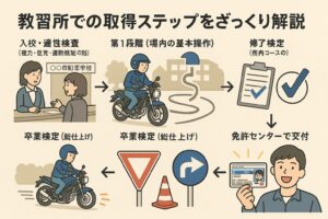 ここからは実務の話。教習所で普通自動二輪(MT)を取る全体像を、申し込みから免許交付までワンストロークで把握できるようにまとめます。流れをつかんでおくと、予約の取り方や学科・技能の配分、検定日の逆算がやりやすくなりますよ。結論、入校→第1段階→修了検定→第2段階→卒業検定→免許センター手続きの6ステップ。ここを理解しておくと、無駄打ちが減って時短に効きます。