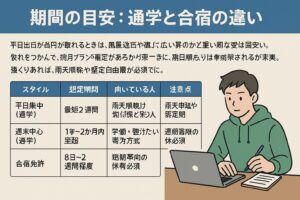 | 週末中心(通学) | 1〜2か月前後 | 学業・仕事と両立したい人 | 繁忙期は予約が詰まりやすい |