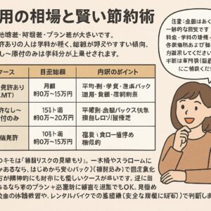 | 合宿免許 | 約10万〜15万円 | 宿泊・食事込みのパックが主流 | 交通費込みか要確認。閑散期は狙い目 |