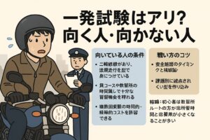 結論:初心者は教習所ルートの方が総所要時間と総費用が小さくなることが多いです。どうしても一発試験で挑むなら、直前にプロの実地レッスンを受けるのが近道です。
