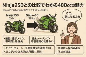 Ninja250かNinja400か、ここで迷う人が多い。両者のキャラクターははっきりしていて、軽快感・維持費の軽さを取るなら250、高速域の余裕・積載の拡張性・ツーリング適性まで欲しいなら400がフィットします。ニンジャ400は167kg級の軽さと並列2気筒の厚いトルクで、街中のストップ&ゴーが楽なうえ、高速合流や追い越しで一段階上の安心感をくれます。