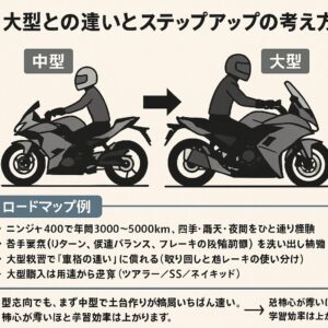 大型二輪は魅力です。パワー、高速安定性、車体の懐の深さは別物。ただ、その分だけ免許取得の難易度、車両価格、保険、消耗品コスト、取り回しの負荷も上がります。まずはニンジャ400で「余裕を持って扱える状態」を作るのが、最終的に大型を楽しむ最短ルート。渋滞・雨天・夜間・ワインディング・高速と、一通りのシチュエーションを経験してからステップすると、上達速度が段違いです。