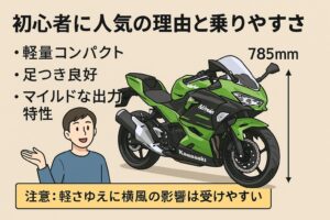 ニンジャ400は、軽量コンパクト×足つき良好×マイルドな出力特性――この三拍子が強い。シート高785mmは多くの体格で両足の接地感を得やすく、低速の取り回しで不安が出にくい。エンジンは低中速トルクが素直で、クラッチミートがつかみやすいのでエンストリスクも低めです。ABS標準で、初期制動の立ち上がりが穏やかなのもコントロール性に寄与しています。