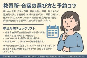 予約は検定日から逆算してブロックで押さえるのがコツ。見極め→検定の間隔を空けすぎないだけで合格率が上がります。