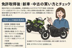 免許が取れたら次は相棒探し。新車重視ならカワサキプラザで保証・初回点検・リコール対応までワンストップが安心。中古は価格の自由度が高く、程度の良い個体を掘れるのが魅力です。ただし初めての一台は、現車確認と試乗(可能なら)を強く推します。