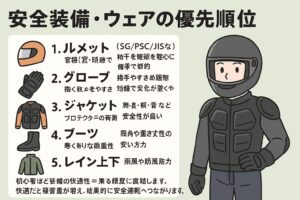 バイクは装備が命綱。優先順位はヘルメット→グローブ→ジャケット→ブーツ→レイン上下。ヘルメットは規格(SG/PSC/JISなど)適合を第一にサイズ合わせを丁寧に。グローブはプロテクター付きで、指先感覚が出る薄手〜中厚手を季節で使い分け。ジャケットは肩・肘・胸・背中のプロテクターの有無で安全性が変わります。ブーツはくるぶし保護とソール剛性を重視。雨具は視界の確保と撥水の継続性がポイントです。