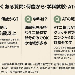 重要:本記事の数値・期間・費用は一般的な目安です。正確な要件・最新の試験要領は必ず公式情報をご確認ください。判断に迷う場合は地域の教習所・免許センターなど専門家にご相談ください。