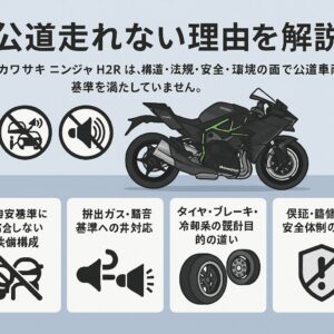カワサキ ニンジャ H2Rが公道を走行できないのは、単なる「高出力すぎるから」ではなく、構造・法規・安全・環境のすべての面で公道車両の基準を満たしていないためです。