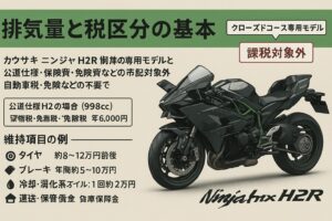 カワサキ ニンジャ H2Rの排気量は998ccで、公道仕様のH2およびH2 SXシリーズと同一の排気量帯に属します。しかし、H2Rは「クローズドコース専用モデル」であるため、一般の公道車両とは異なり、自動車税・重量税・自賠責保険などの課税対象外です。登録が行われないため、陸運局での車両ナンバー取得や車検も不要となります。