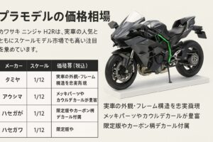 カワサキ ニンジャ H2Rは、実車の人気とともにスケールモデル市場でも高い注目を集めています。タミヤやハセガワ、アオシマなど国内主要模型メーカーが1/12スケールを中心に製品化しており、ディテール再現度や素材の質感にこだわったモデルが多数販売されています。