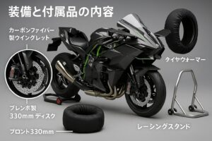 装備面に加え、H2Rの購入者には特別な付属品が提供されます。純正で同梱されるタイヤウォーマーレーシングスタンドは、サーキット走行を前提とした実用性重視の構成です。タイヤウォーマーは走行前にタイヤ温度を最適化し、グリップ力を最大限に引き出す役割を果たします。これにより、スタート直後から安定した走行が可能になります。レーシングスタンドは作業性の向上に加え、整備や保管時にも重要な役割を果たします。